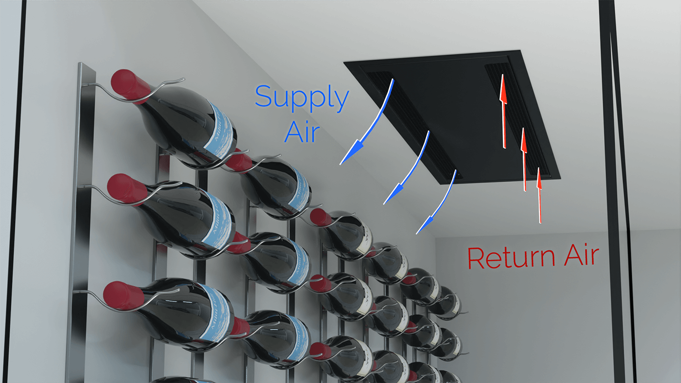 Wine Guardian’s Wine Wall Cooling System provides optimal cooling and airflow to maintain long-term wine storage conditions. It was designed to mount completely flush with the ceiling of a wine wall so that no obtrusive wine cooling equipment is visible in the space. The system has the ability to control wine wall conditions for both long-term storage (55°F/13°C to 58°F/14°C) and serving temperatures (down to 45°F/7°C).